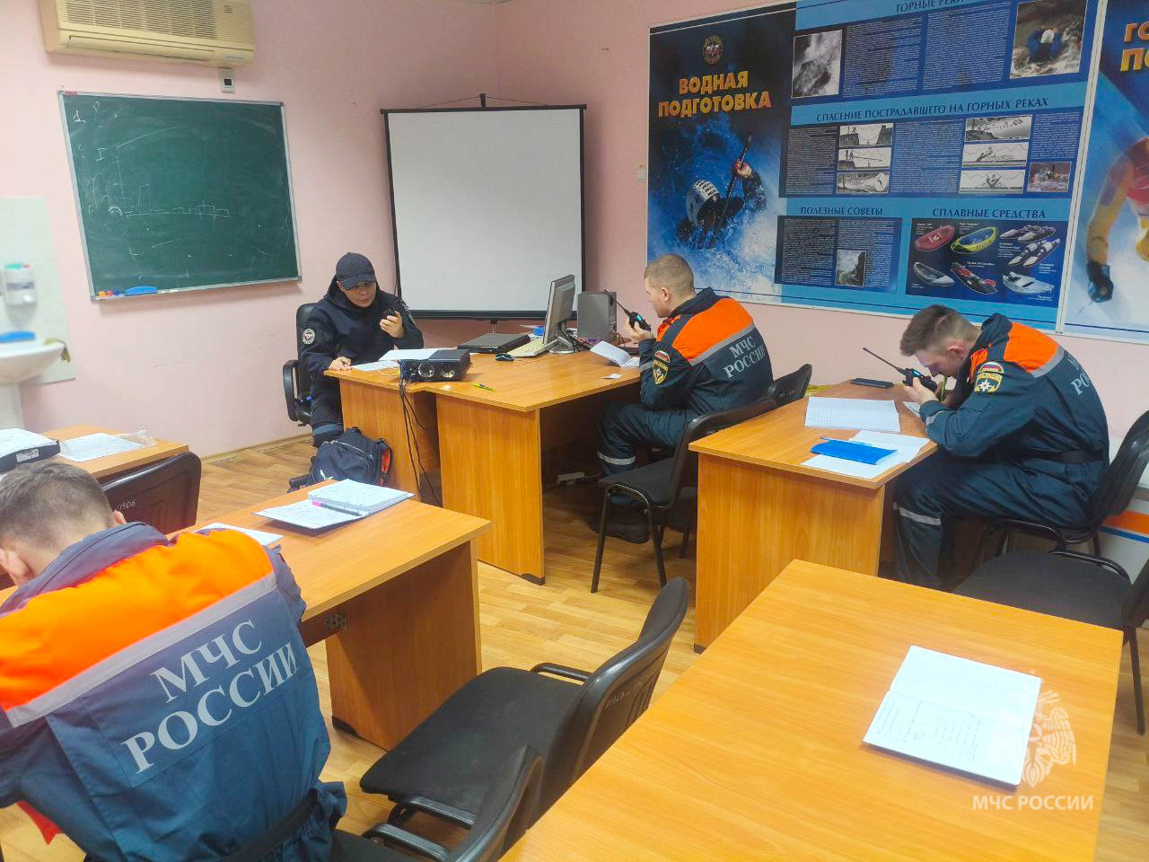 На лекциях спасатели изучают принцип построения аппаратуры с частотным разделением сигналов, виды и средства радиосвязи, правила выбора места для развертывания радиостанции в горах при ведении поисково-спасательных работ.